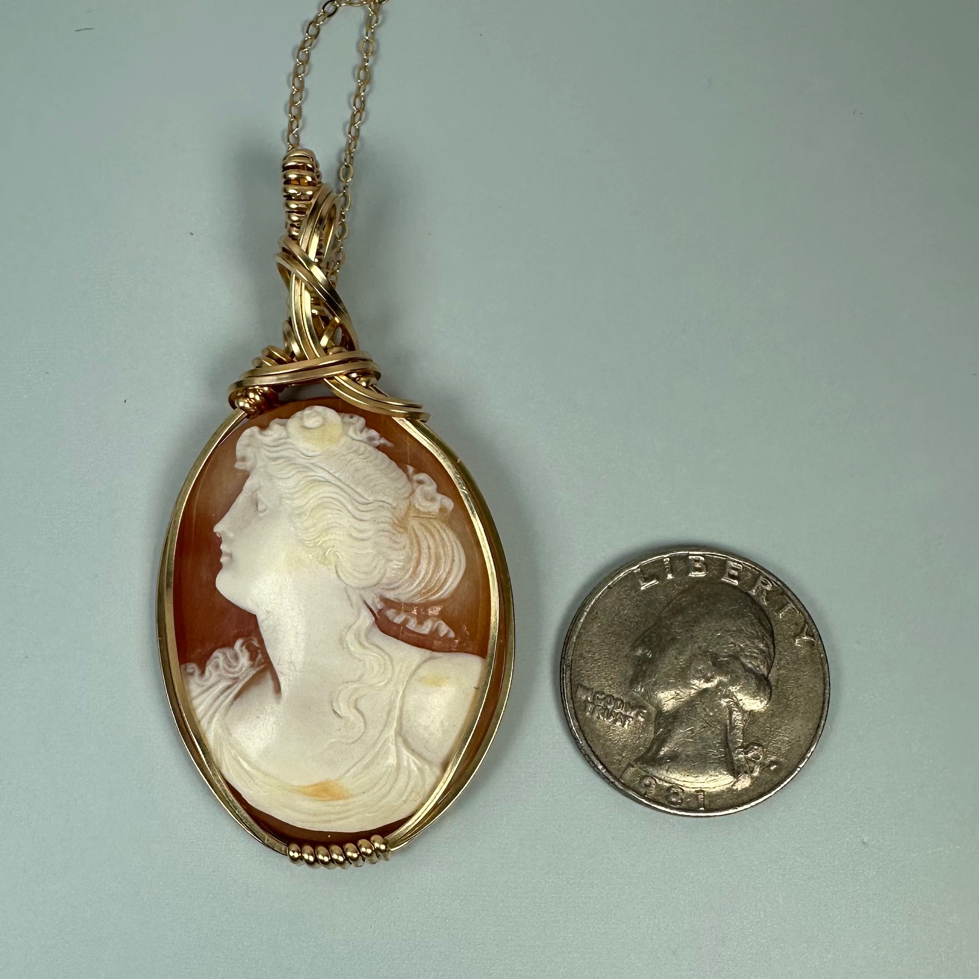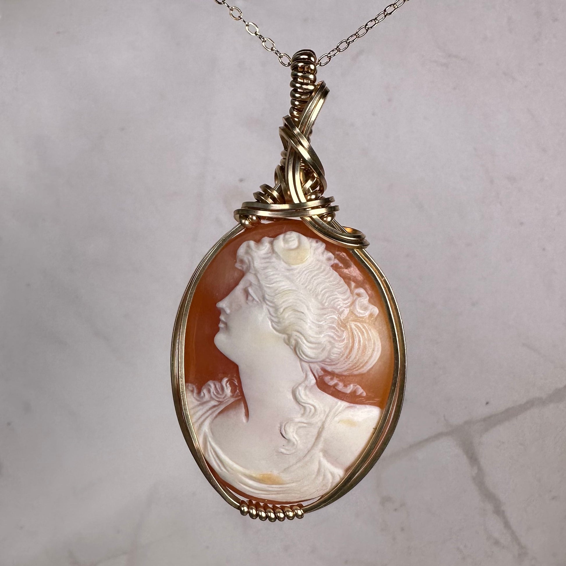 Antique Victorian/Edwardian Carved Shell Cameo Portrait of the Goddess Diana Pendant Wire-Wrapped in 14k Goldfilled Wire
