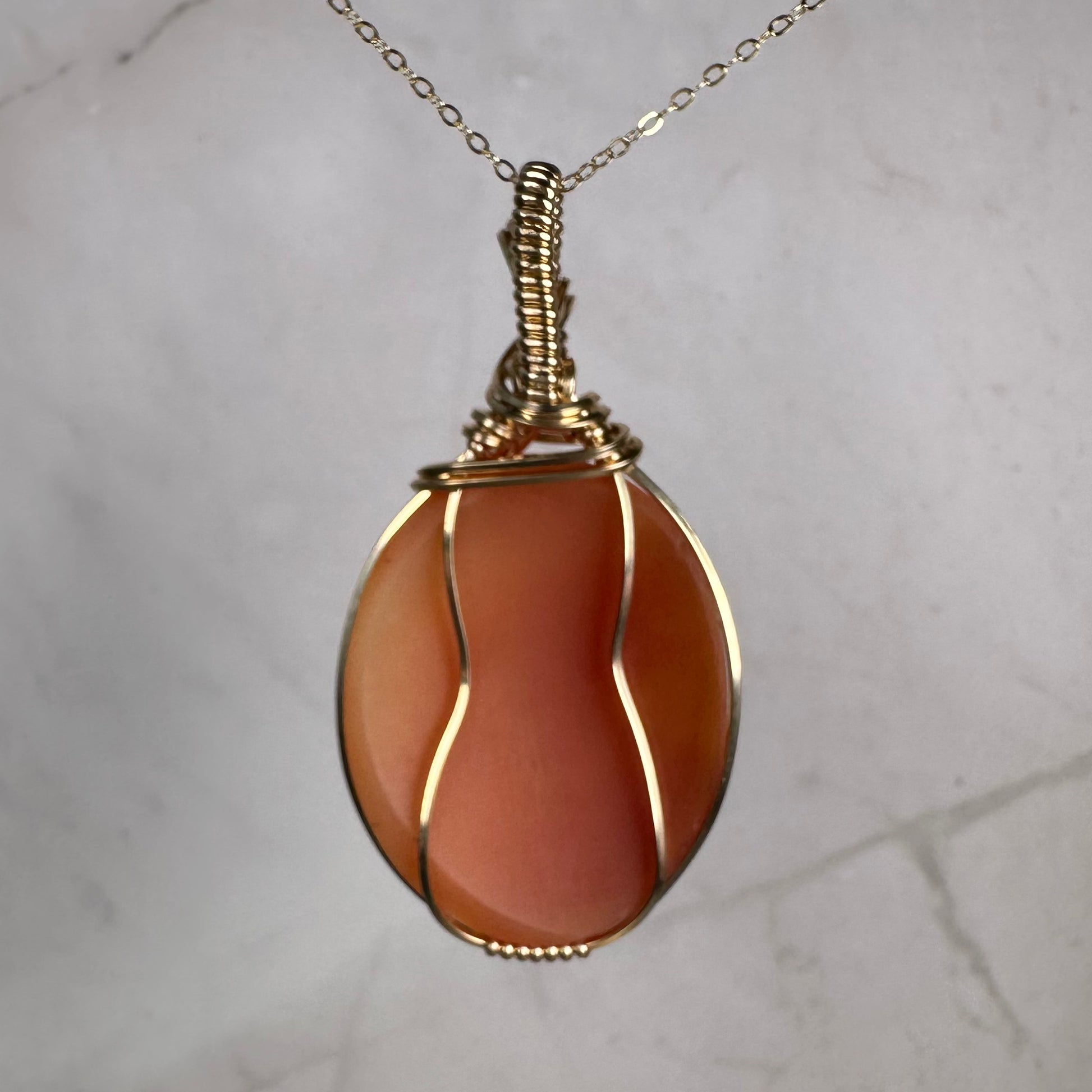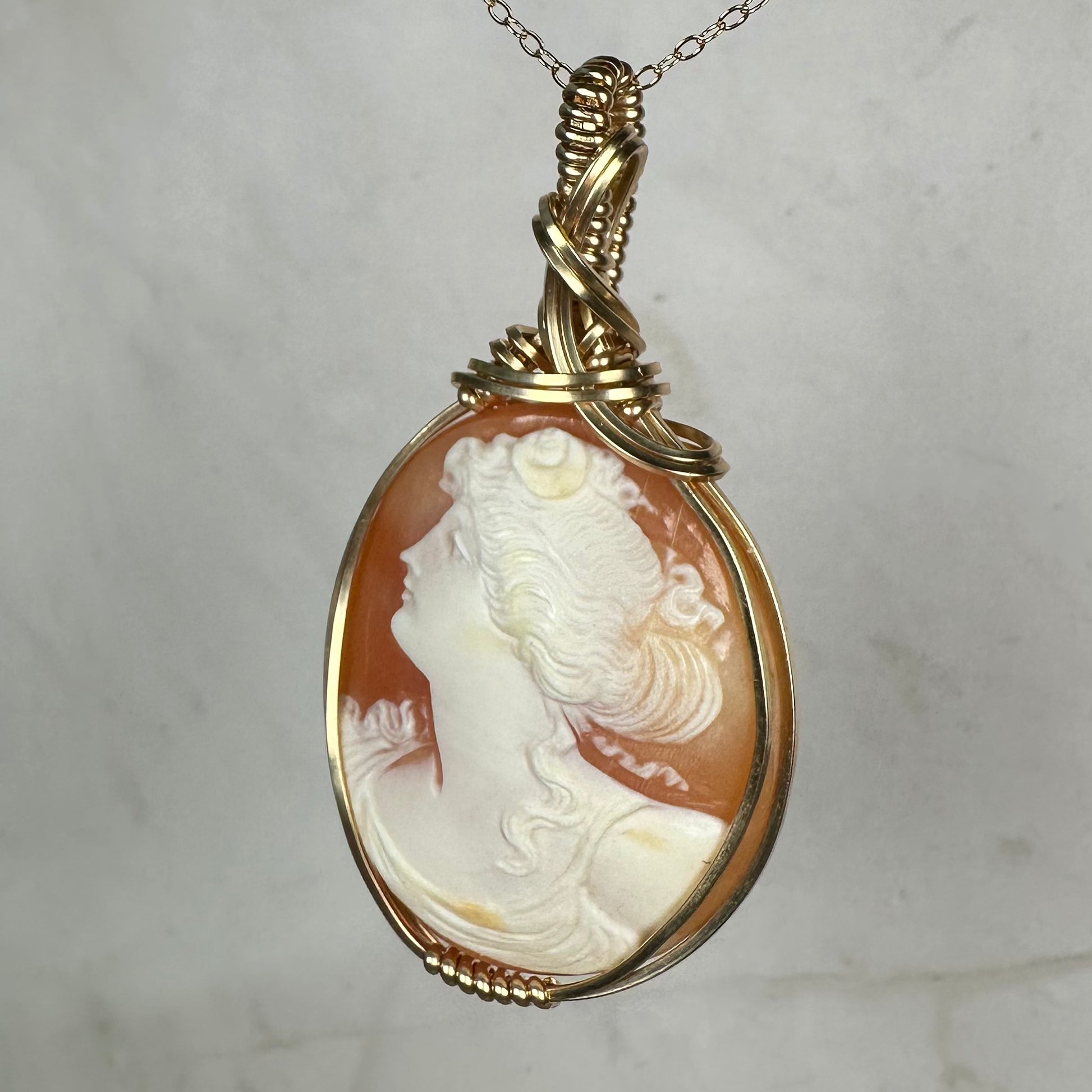 I have wrapped this stunning antique carved shell cameo pendant in 14k goldfilled wire with a swirling design around the bail. This cameo was carved by taking a piece of conch shell and carving through the natural layers to create the figure seen here. This technique is known as "cameo carving" and has been around since ancient times.