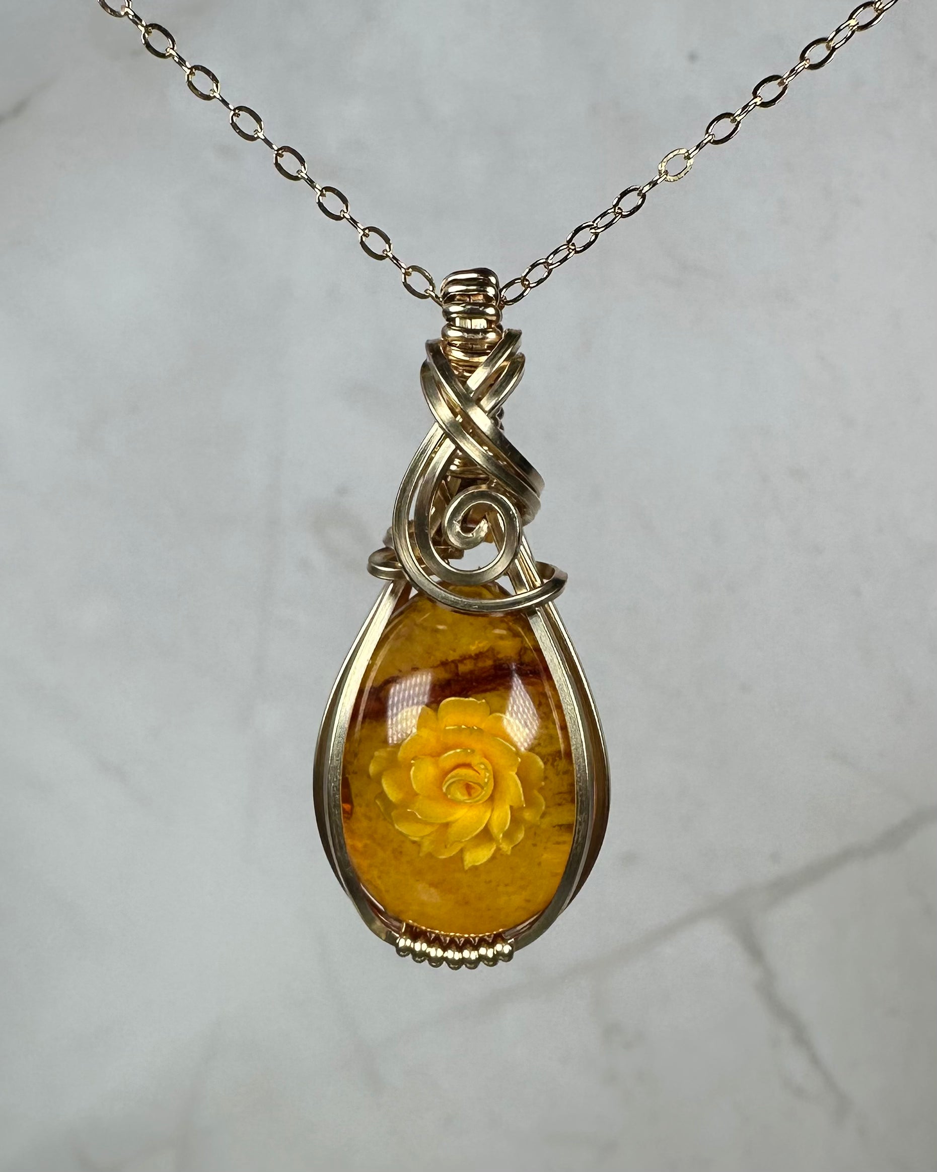 Carved Intaglio Baltic Amber with a Rose Pendant Wire-Wrapped in 14k Goldfill