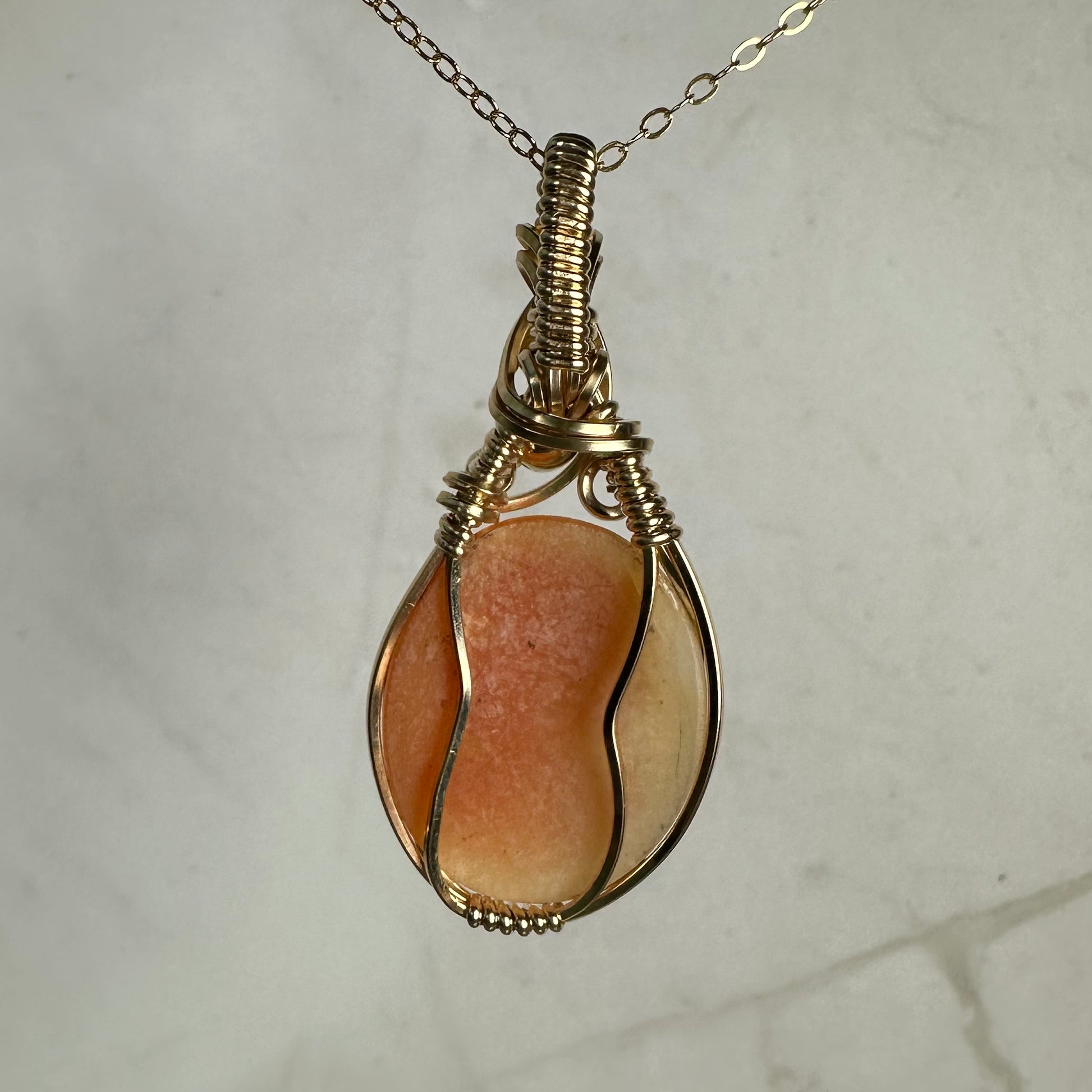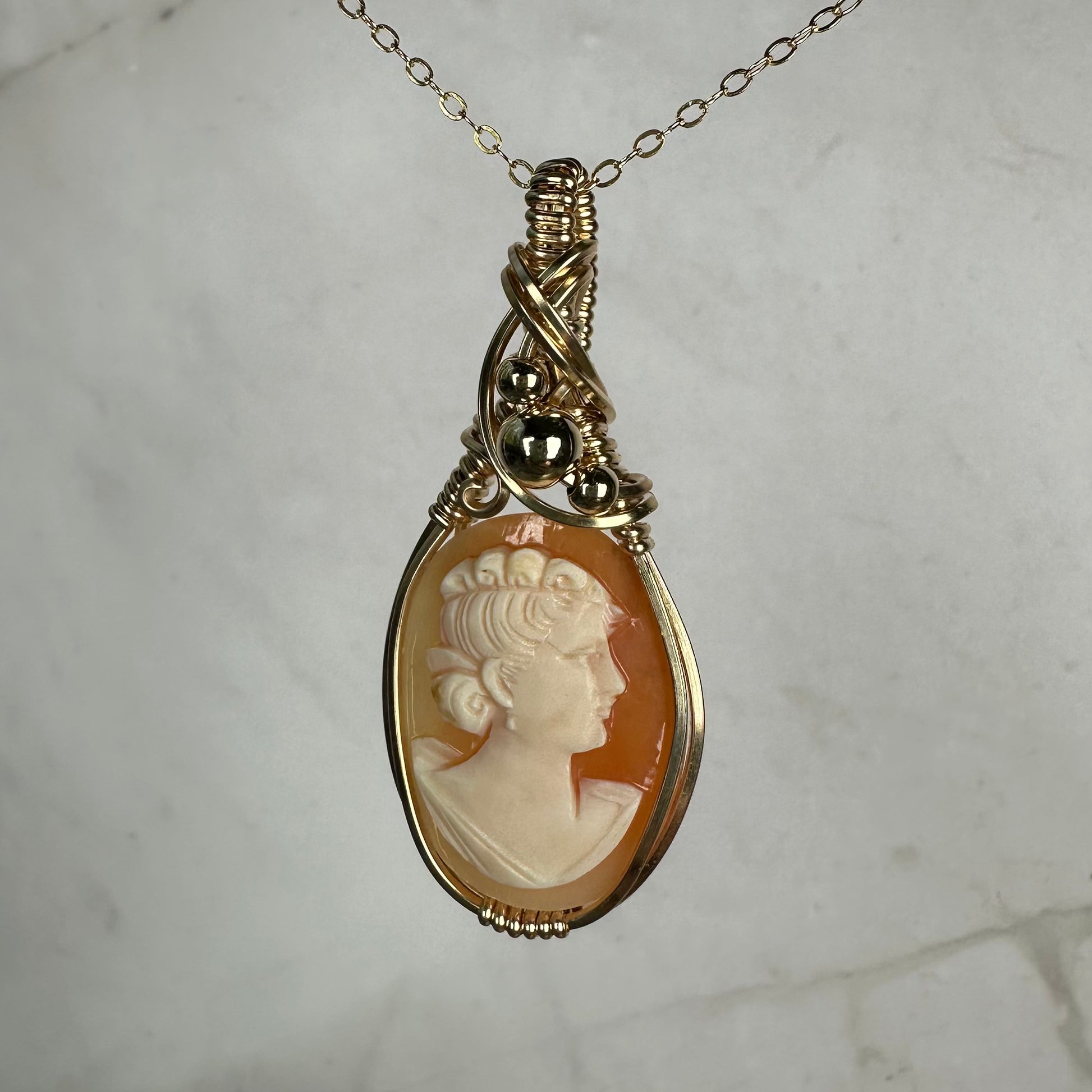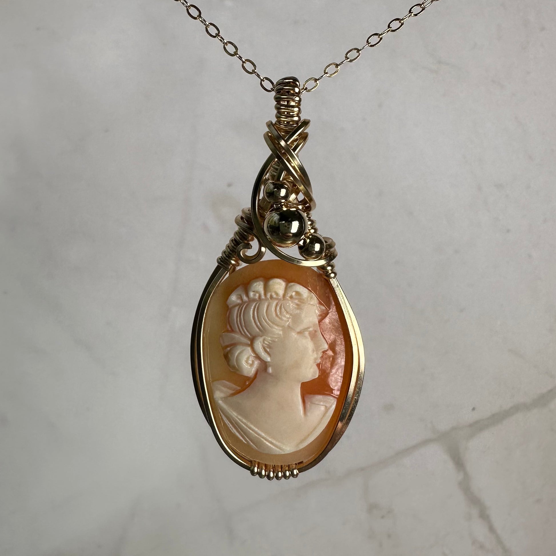 I have wrapped this stunning, vintage carved shell cameo pendant in 14k goldfilled wire with a swirling design around the bail. This cameo was carved by taking a piece of conch shell and carving through the natural layers to create the figure seen here. This technique is known as "cameo carving" and has been around since ancient times.