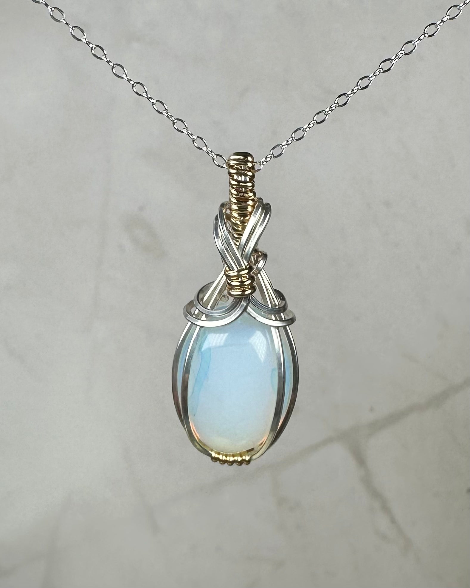 MATERIALS: Sterling silver wire, 14k goldfilled wire, opalite (glass)