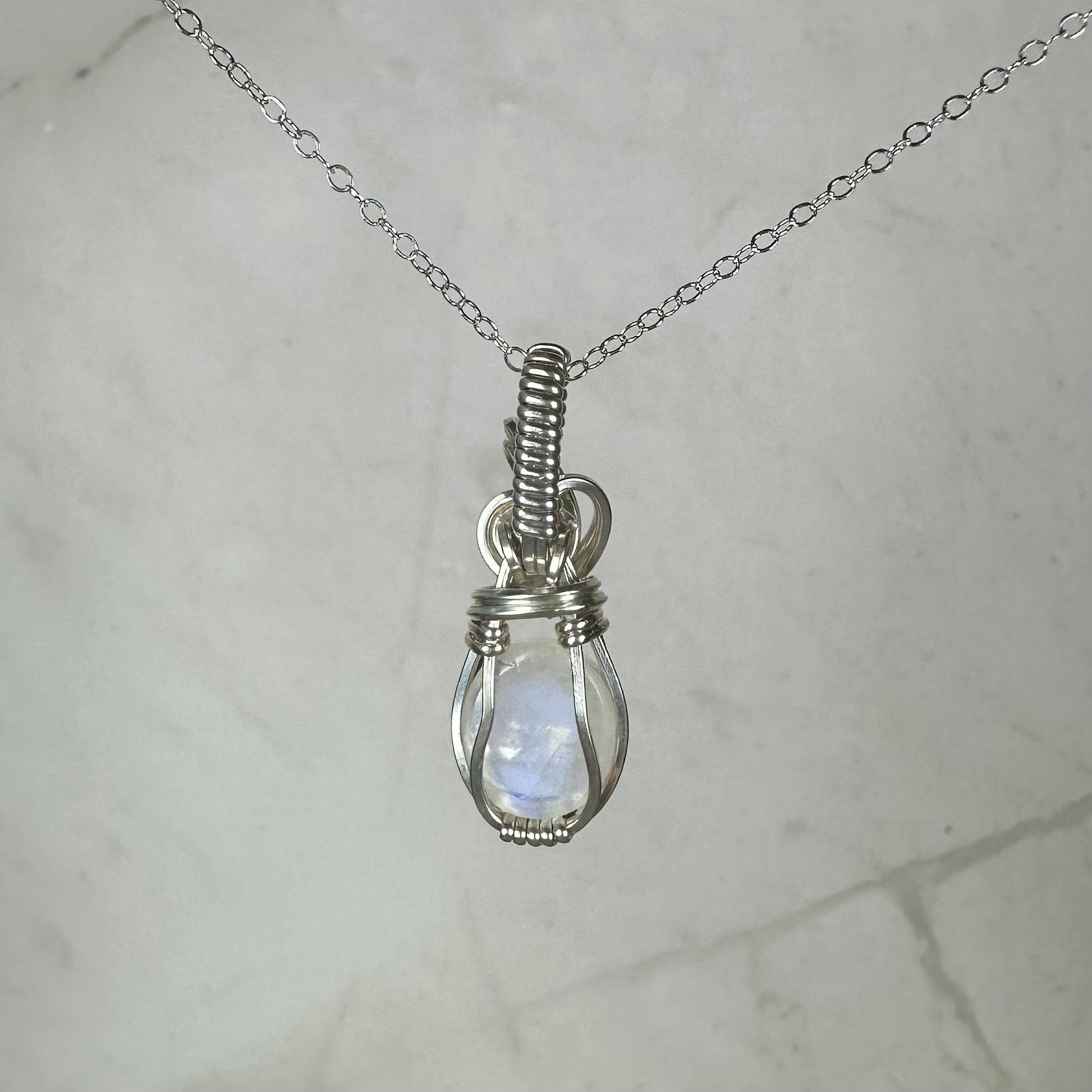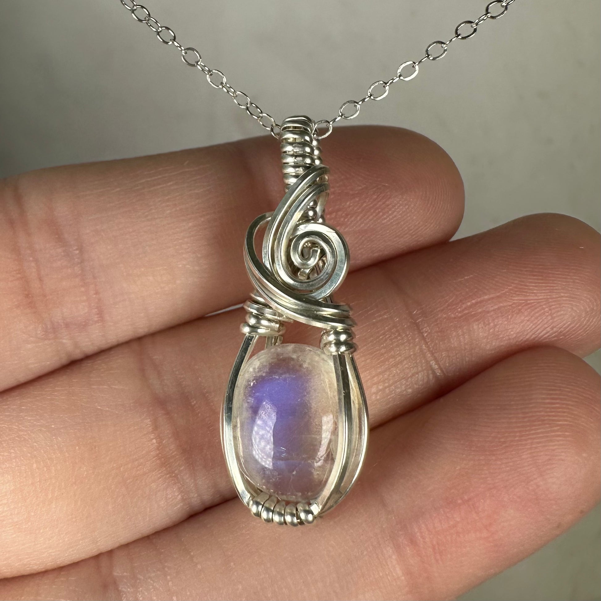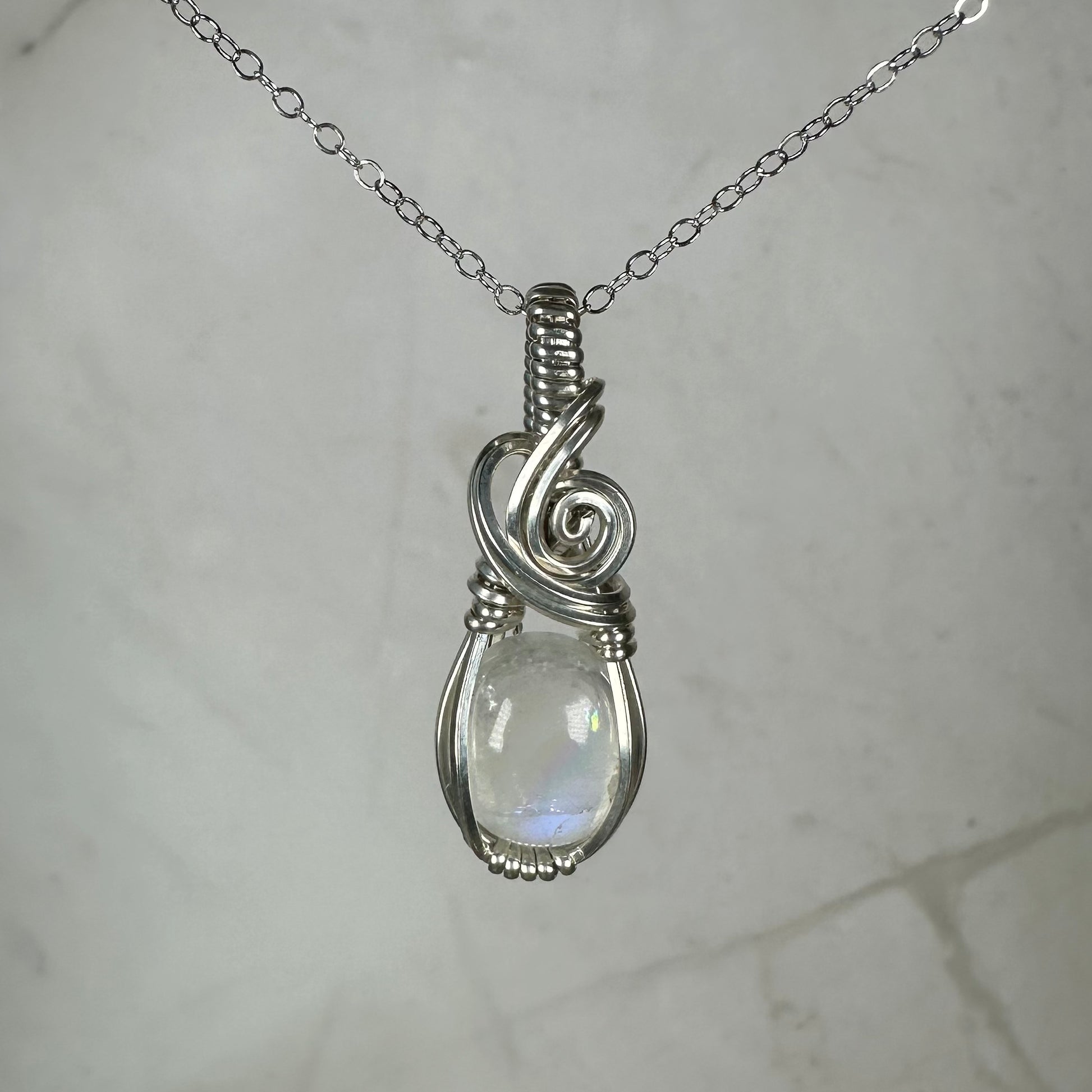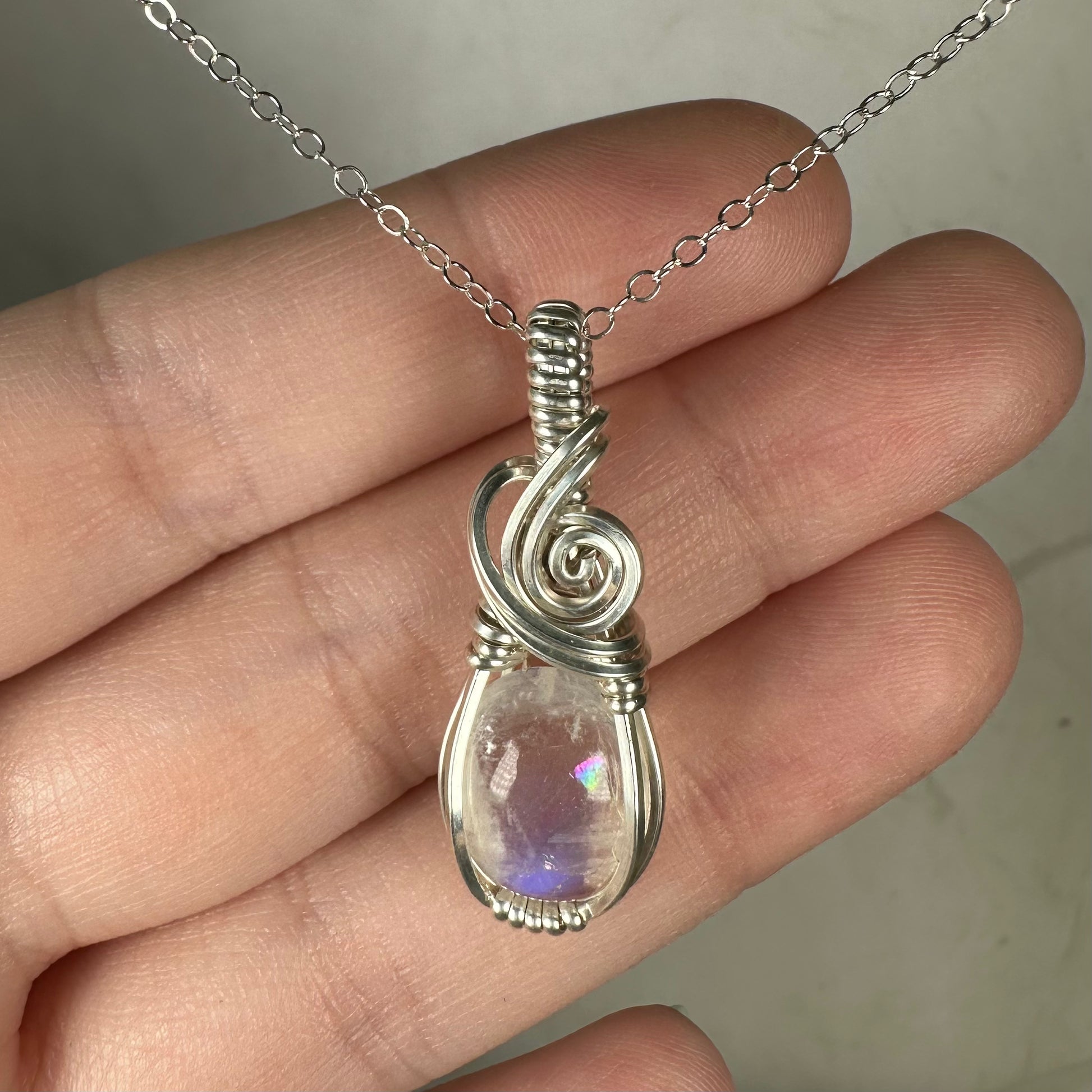 Rainbow Moonstone Pendant Wire-Wrapped in Sterling Silver