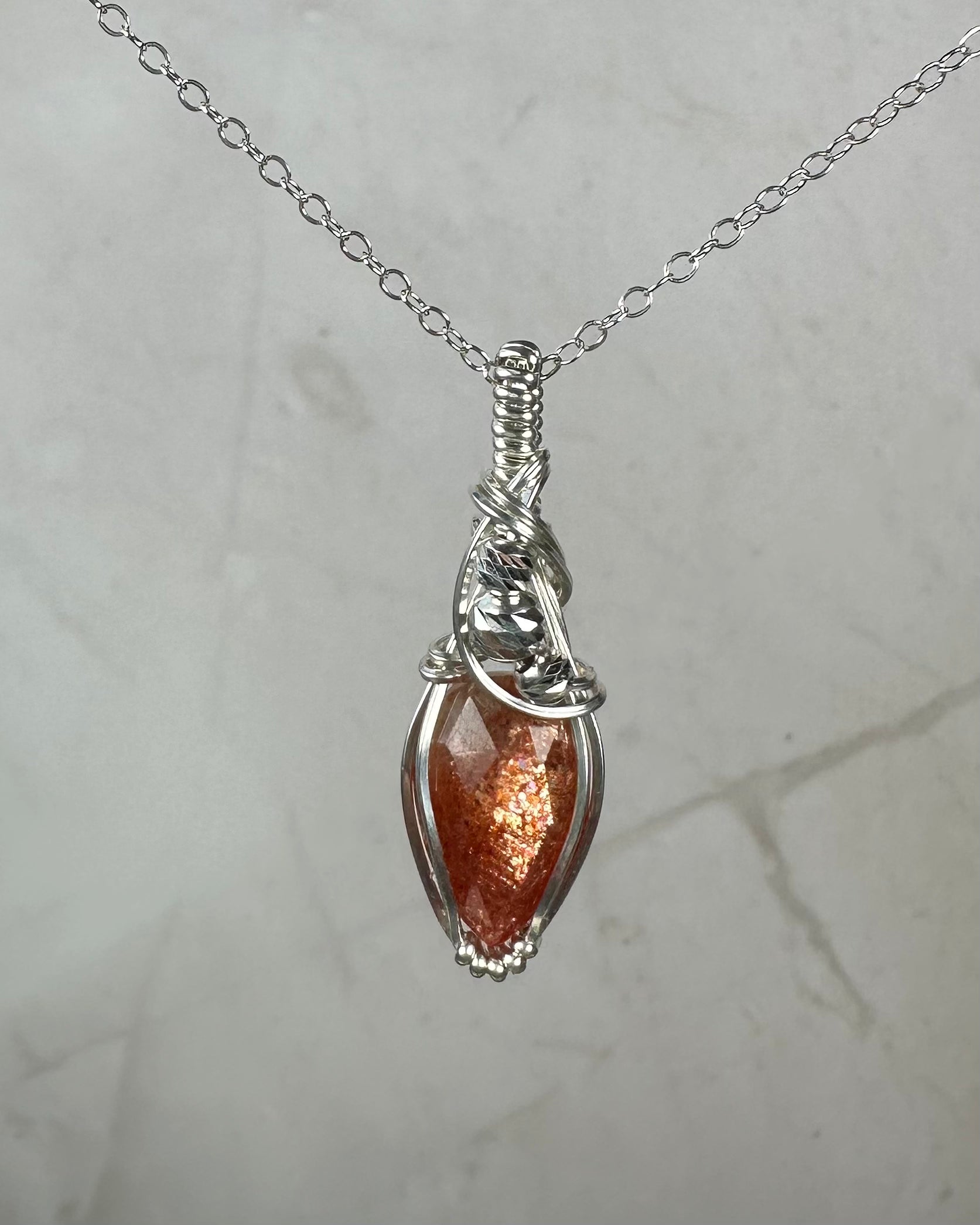 I have wrapped this gorgeous natural sunstone gemstone in sterling silver wire. It would look beautiful on anyone, and is a great gift for anyone who loves high-quality crystals and gemstones! It has been "rosecut," which means it has faceted cuts on its surface that reflect the light and make it shine! It has beautiful sparkle, from a deep orange to a bright silver!