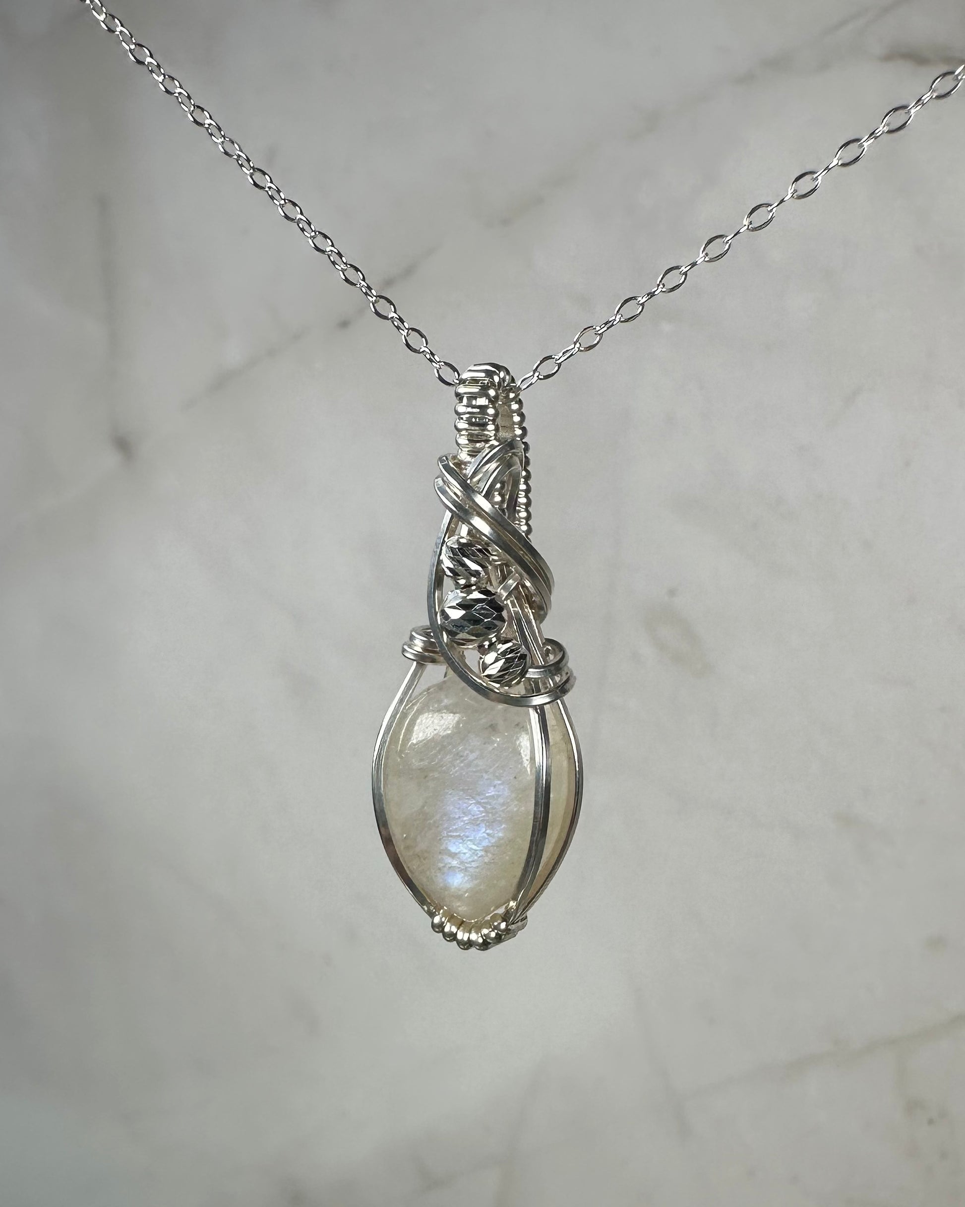 I have wrapped this gorgeous natural African moonstone in bright sterling silver wire with additional sparkly sterling silver beads. It would look beautiful on anyone, and is a great gift for anyone who loves unique, high-quality crystals and gemstones! It has a peachy color that then flashes a beautiful blue when the light hits it!