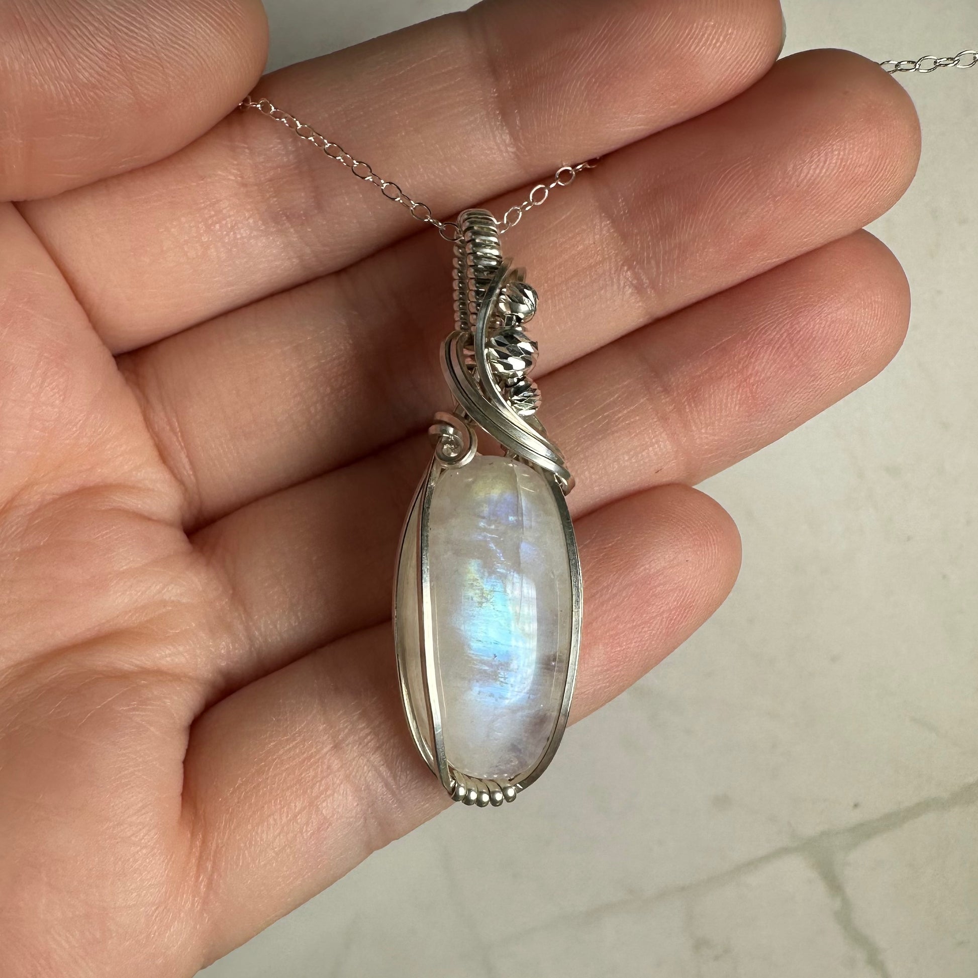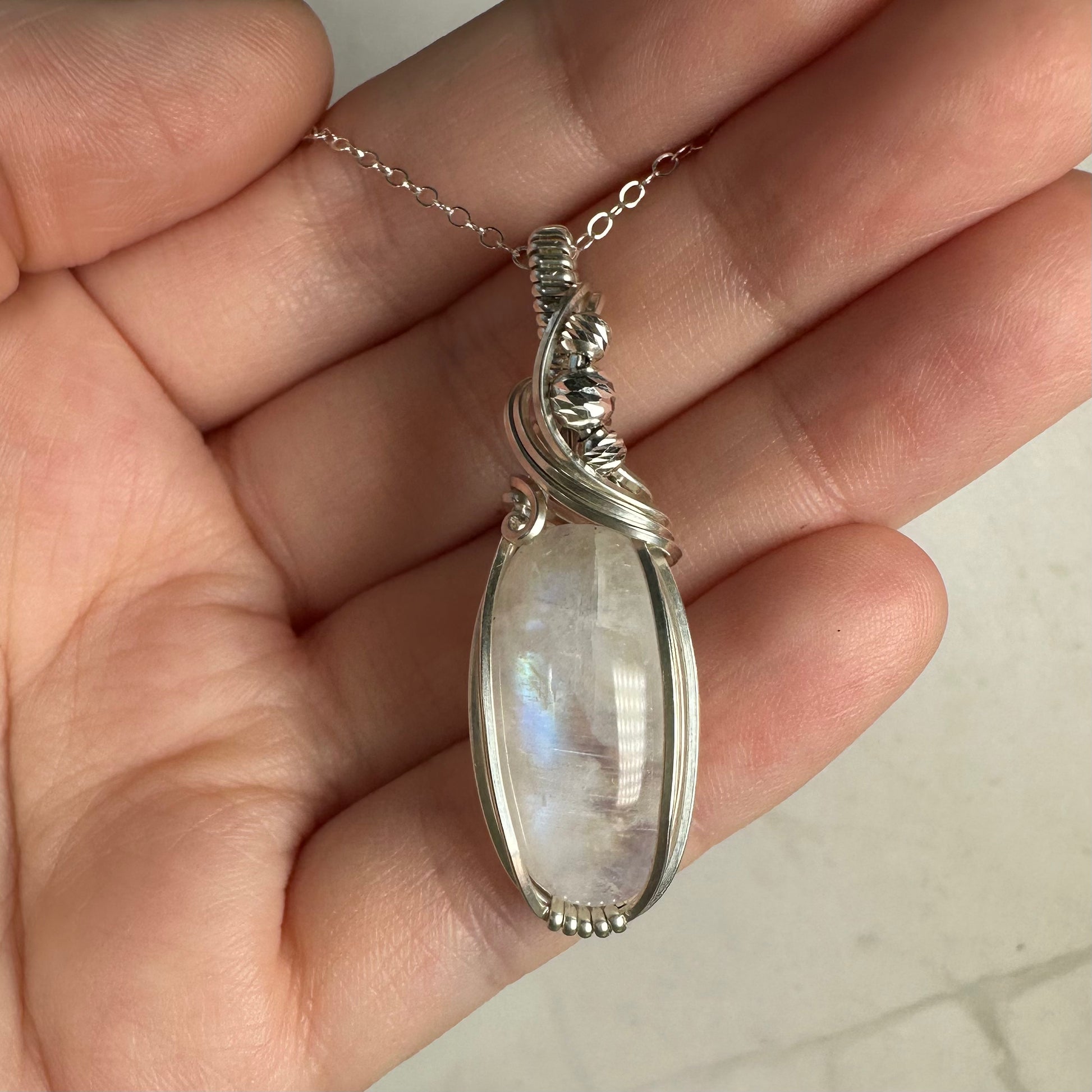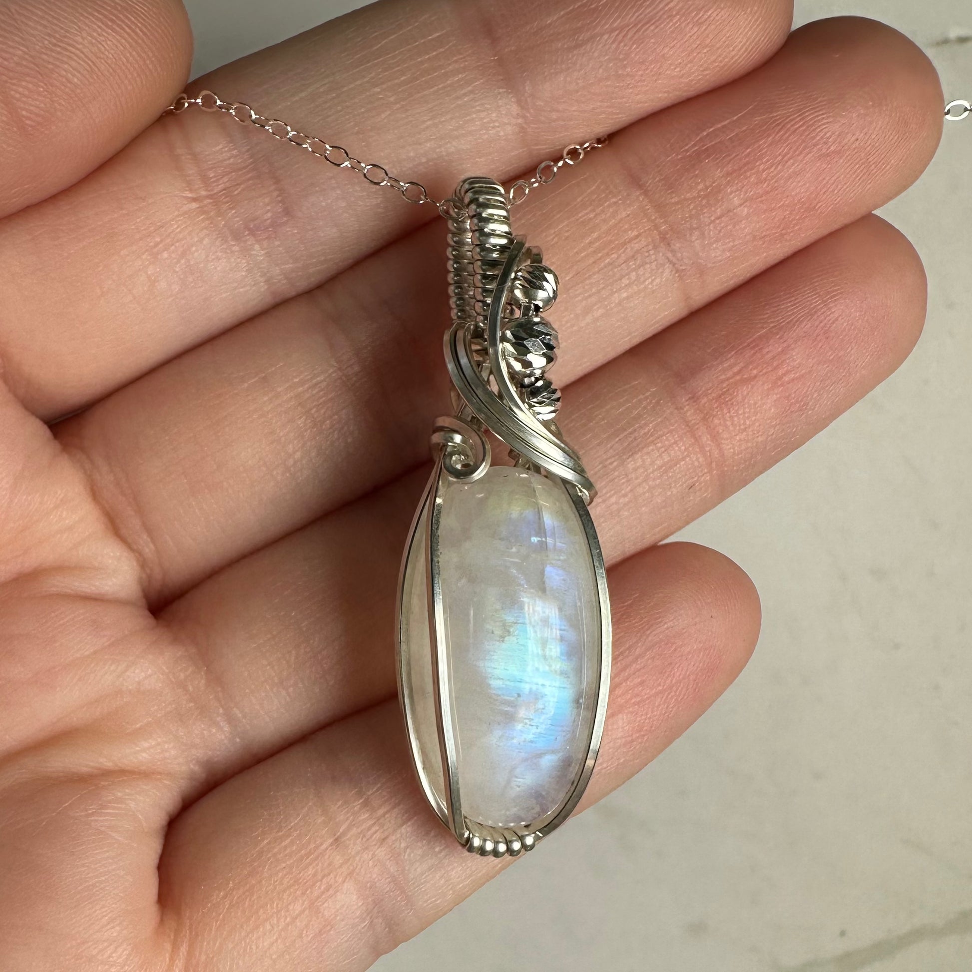 I have wrapped this gorgeous natural rainbow moonstone in bright sterling silver wire. It would look beautiful on anyone, and is a great gift for anyone who loves unique, high-quality crystals and gemstones!