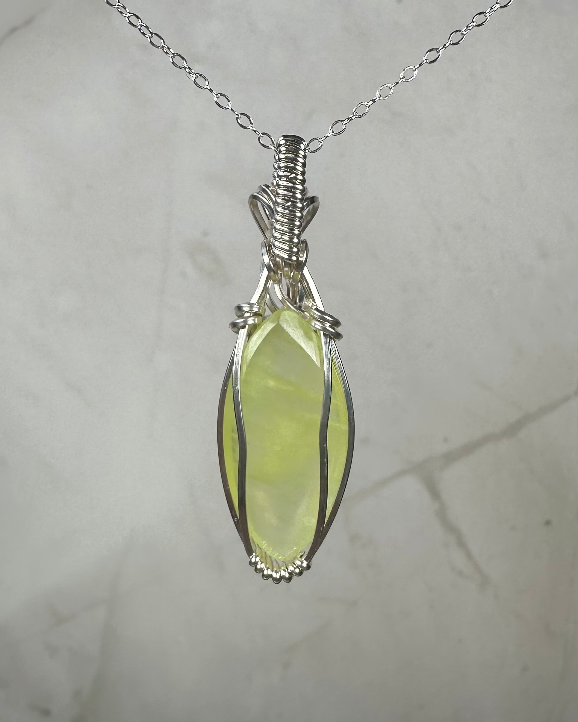 I have wrapped this gorgeous natural greenish-yellow prehnite stone in bright .925 sterling silver wire with a swirling design. This stone is a beautiful yellow/green color! Prehnite is thought to be a stone of "dreaming" and prophecy, and is believed to help in one's communication with other planes of self. It would be an amazing gift for someone who loves unique, one of a kind jewelry!