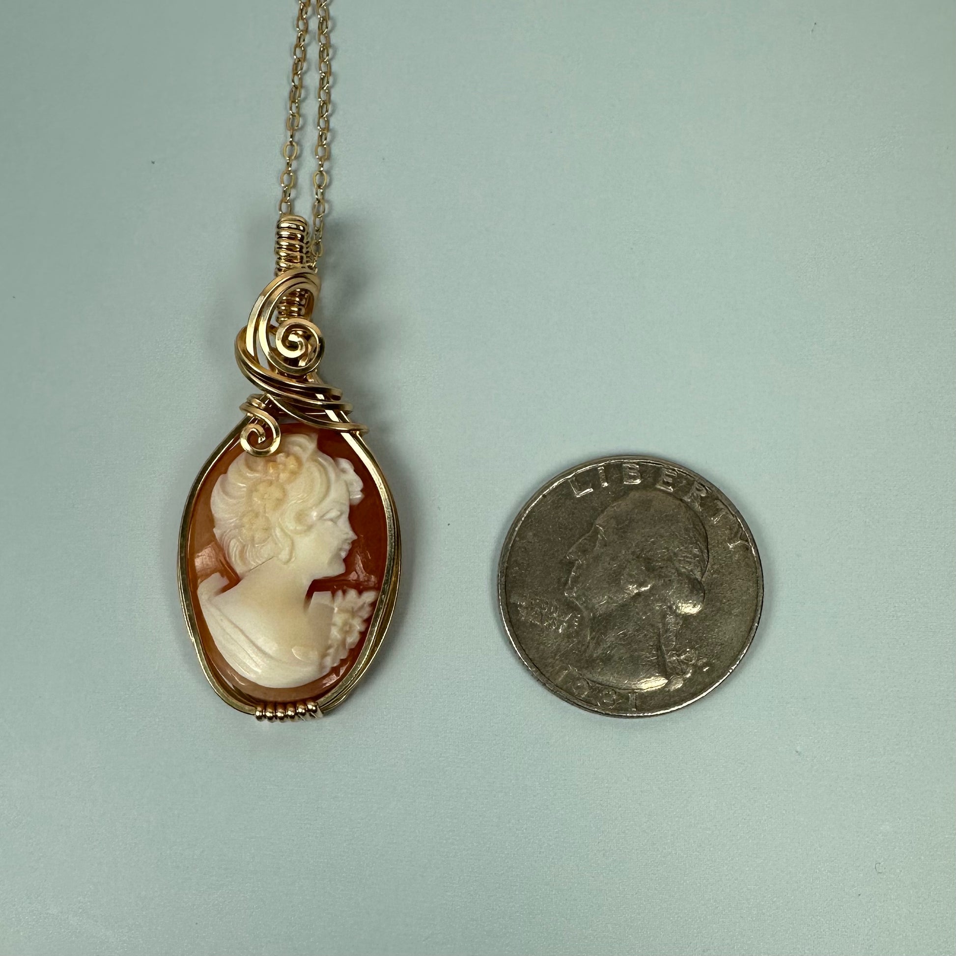 Wire-Wrapped Vintage Carved Shell Cameo of Woman Pendant in 14k Goldfill