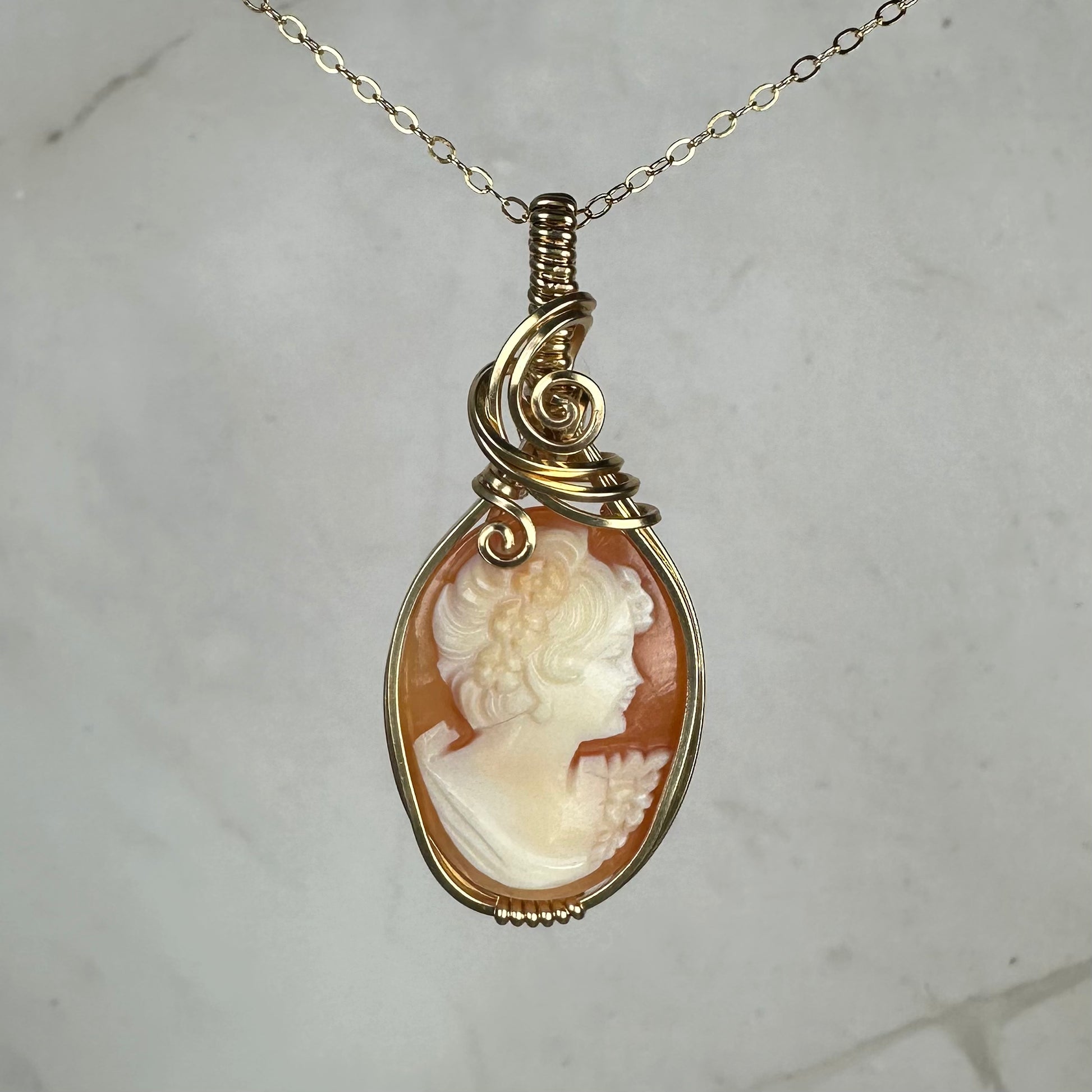 I have wrapped this stunning, vintage carved shell cameo pendant in 14k goldfilled wire with a swirling design around the bail. This cameo was carved by taking a piece of conch shell and carving through the natural layers to create the figure seen here. This technique is known as "cameo carving" and has been around since ancient times.