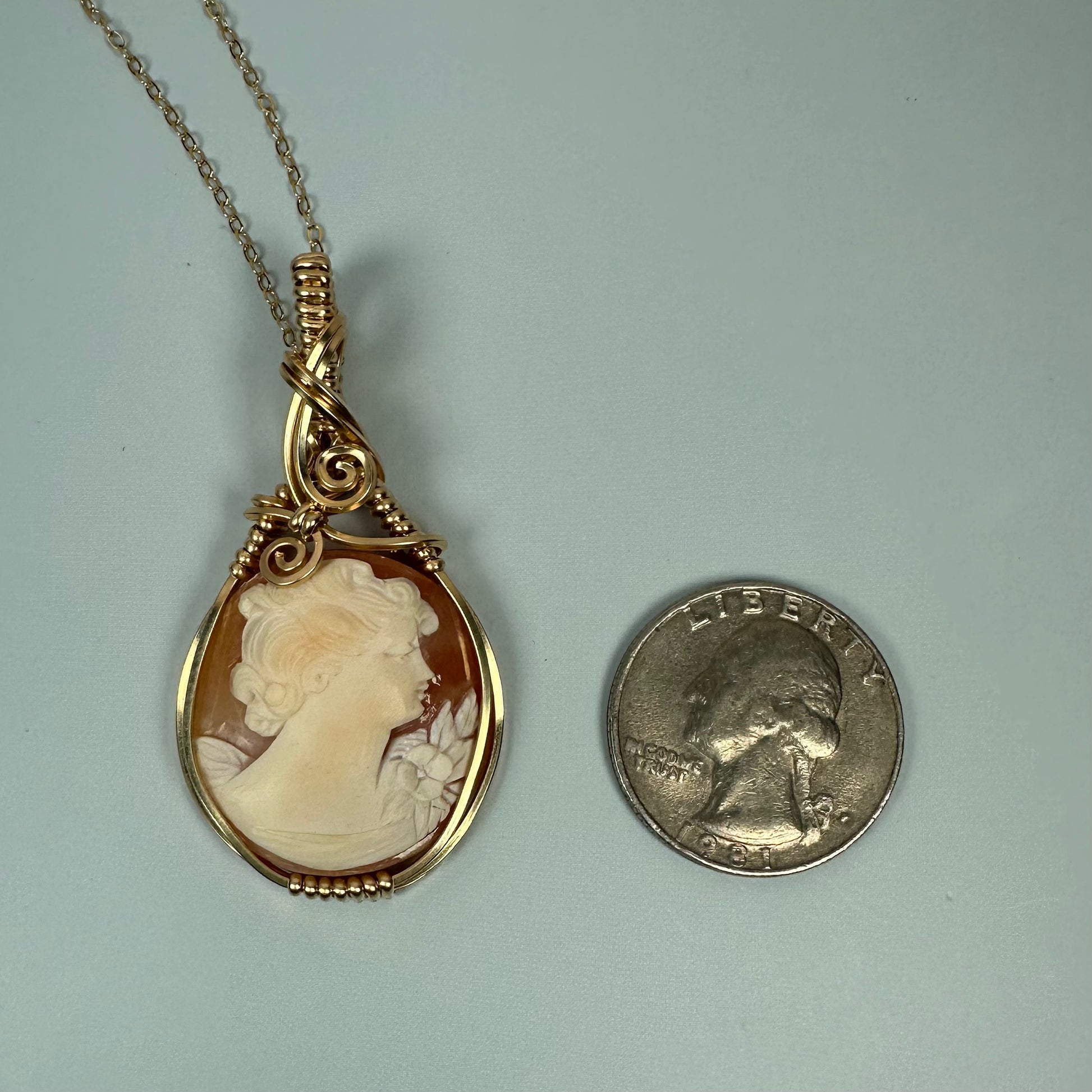 Wire-Wrapped Vintage Carved Shell Cameo of Woman Pendant in 14k Goldfill