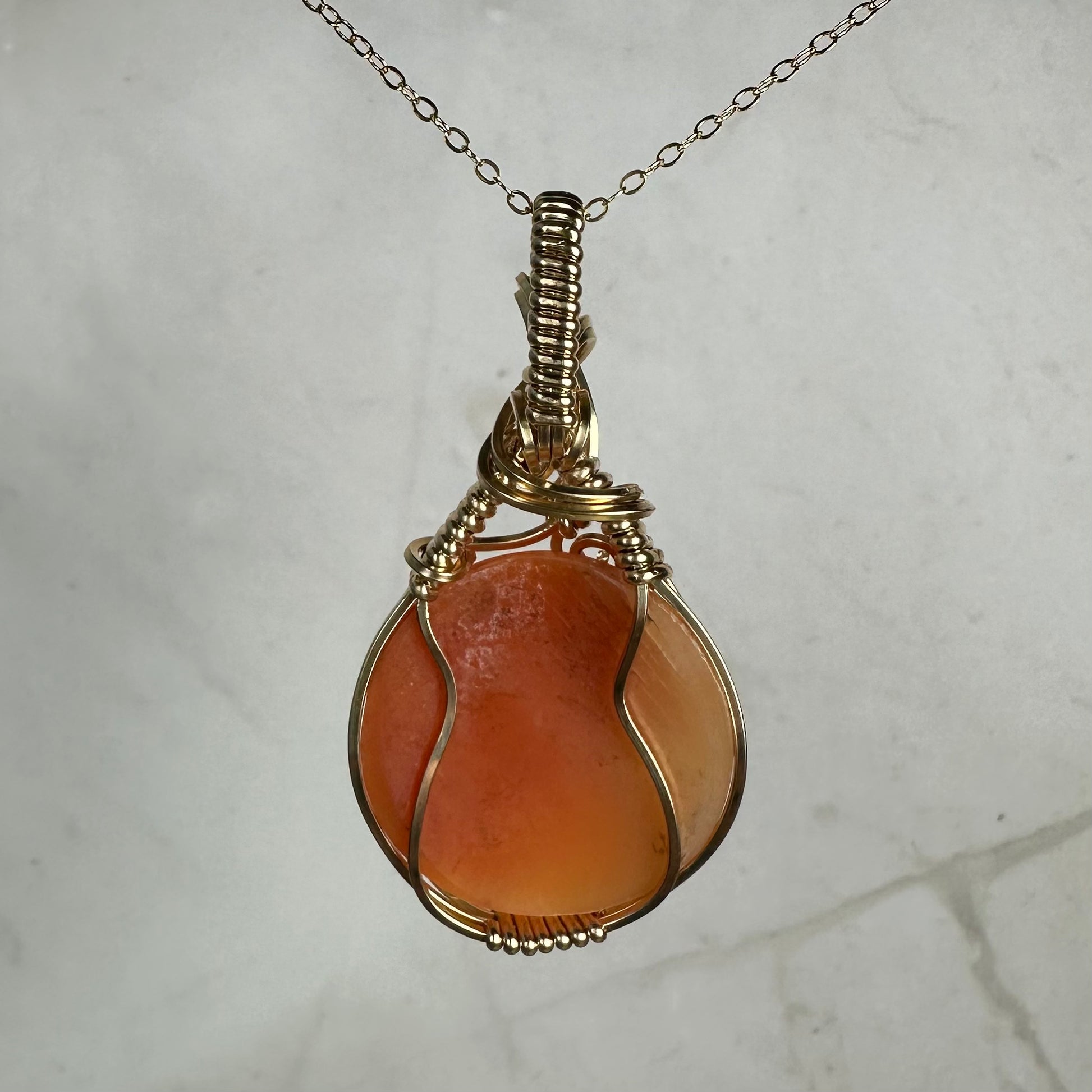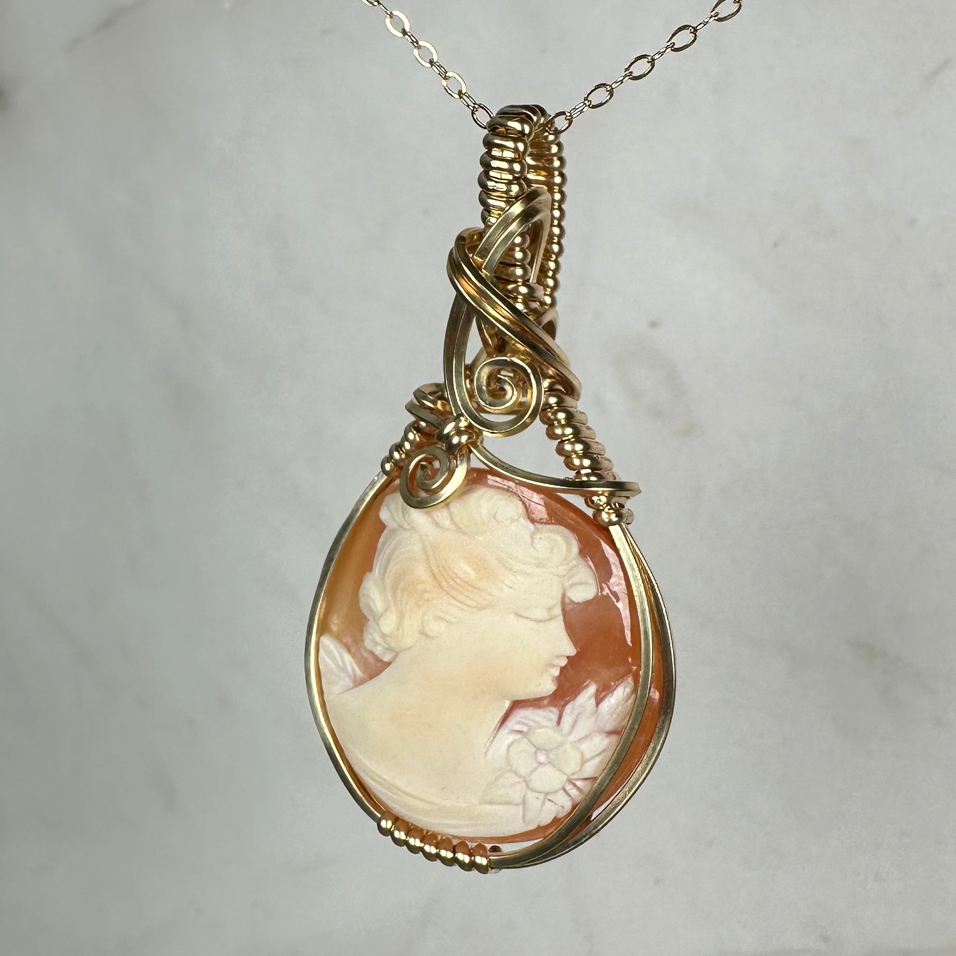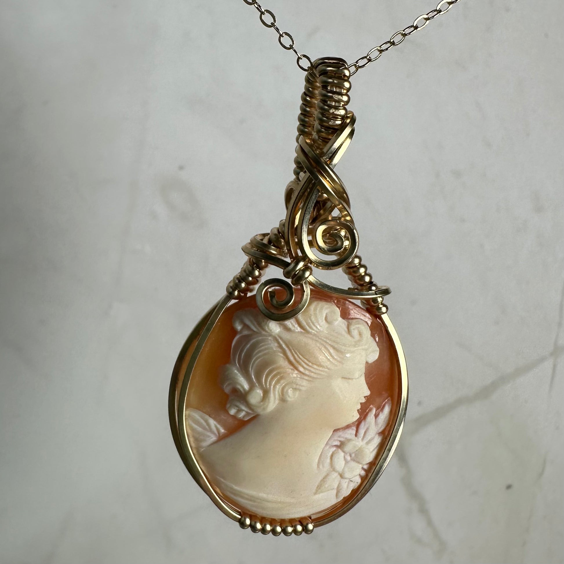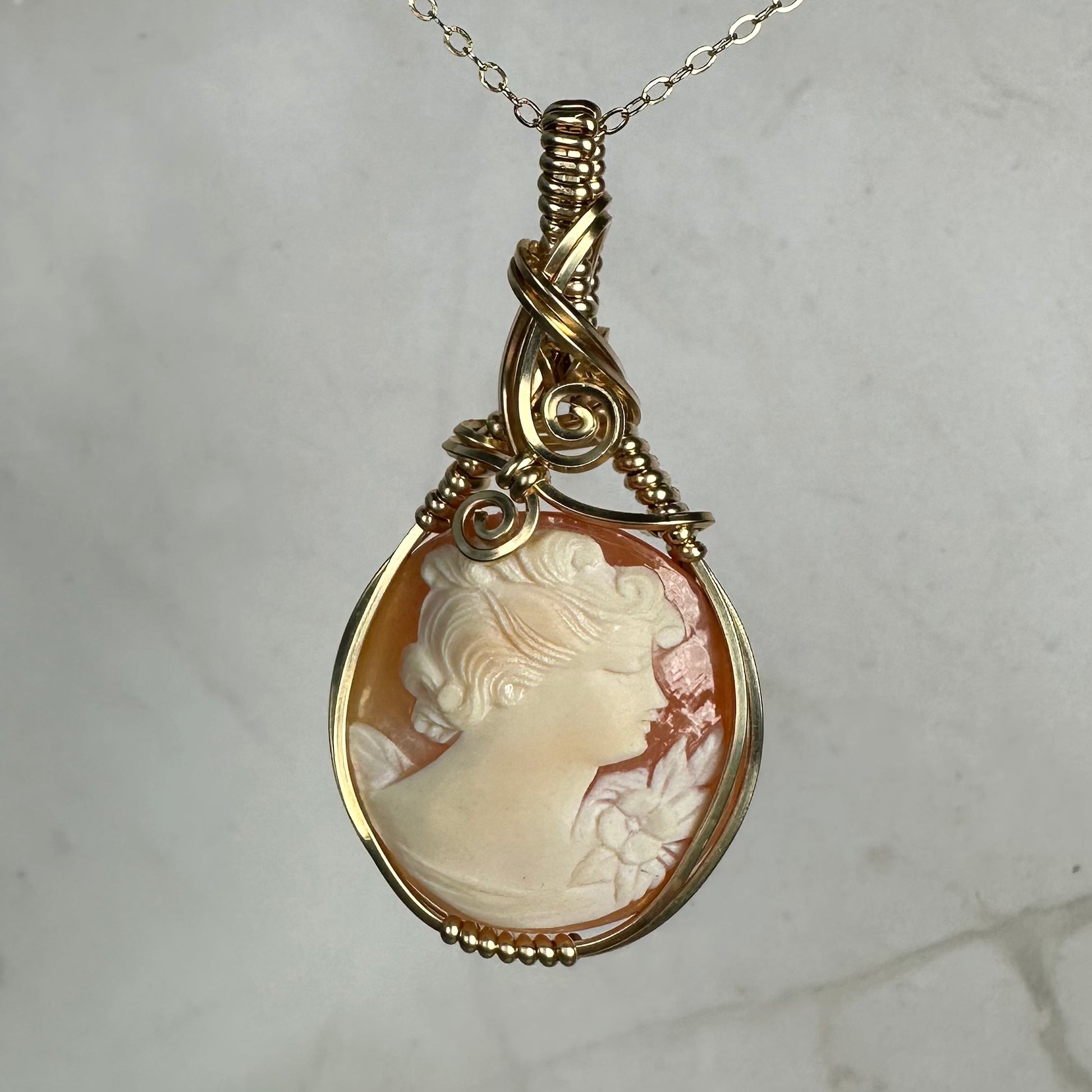 I have wrapped this stunning, vintage carved shell cameo pendant in 14k goldfilled wire with a swirling design around the bail. This cameo was carved by taking a piece of conch shell and carving through the natural layers to create the figure seen here. This technique is known as "cameo carving" and has been around since ancient times.